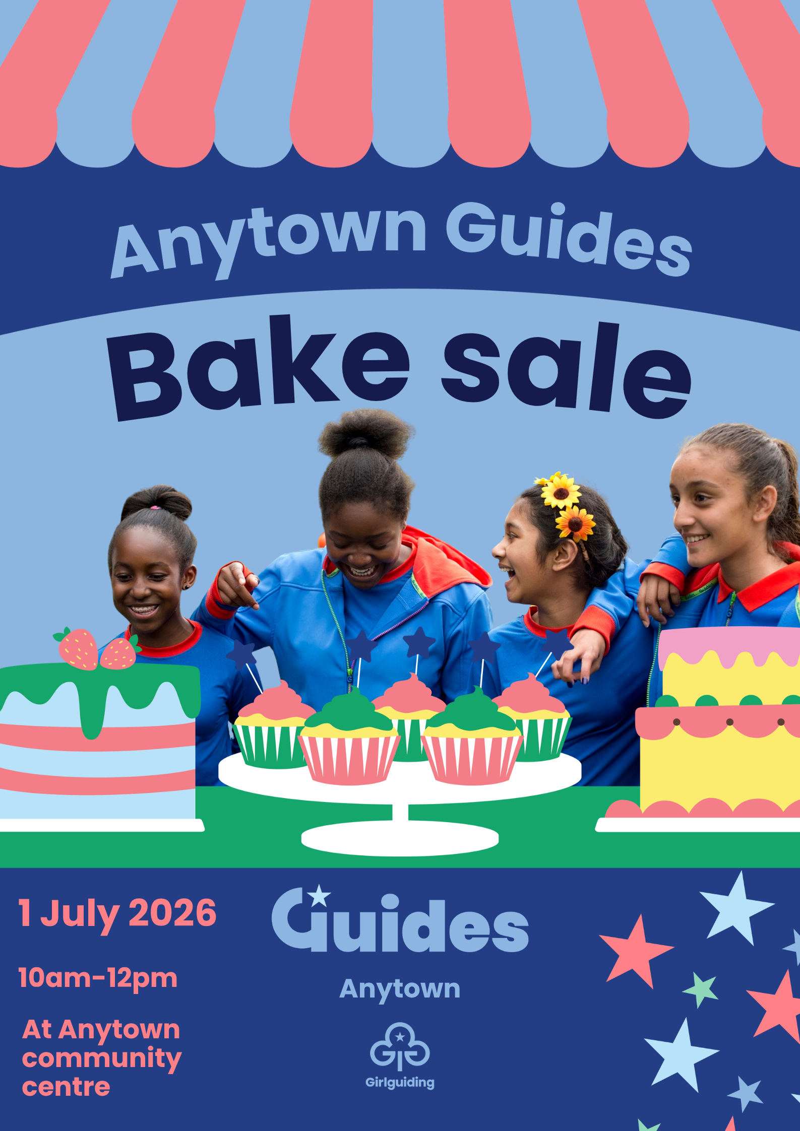 Top Tip! All the cakes and words can be rearranged if you wish to add a photo of three girls manning the stall with the background removed. See the image for an example.