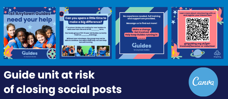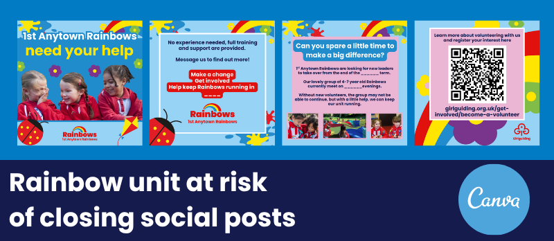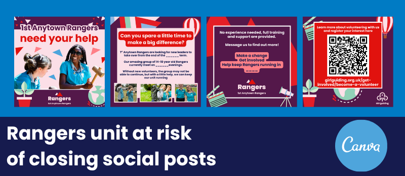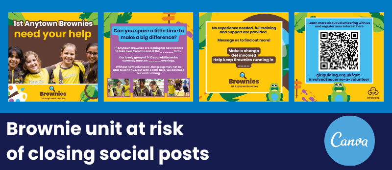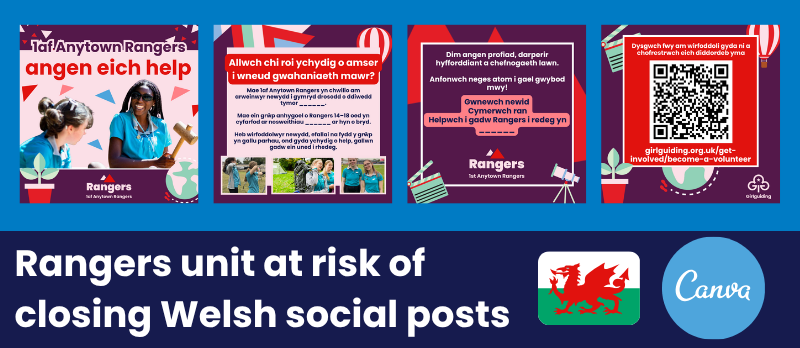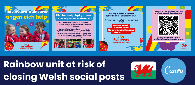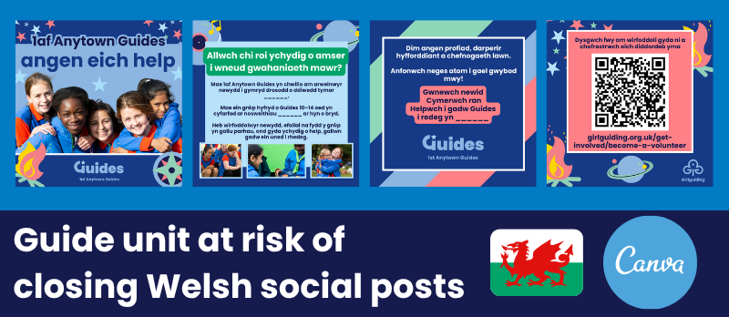 Girlguiding Cymru’s Growth and retention design template library offers a growing collection of Canva templates and editable posters for volunteers. These free resources help you create professional growth resources quickly while using the Girlguiding Cymru brand correctly and consistently. Designed to save time and support guiding activities across Wales, the library is open to everyone in Wales and across the UK.