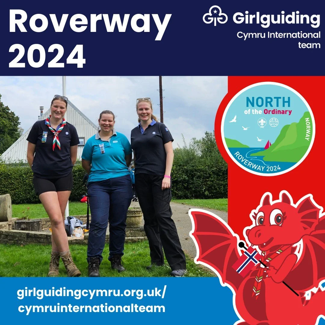 "We are excited to share this photograph of two Girlguiding Cymru representatives who will be joining with Girlguiding Ulster to form a Patrol and a Cymru leader who will be part of the international service team (IST) of Roverway camp in 2024.