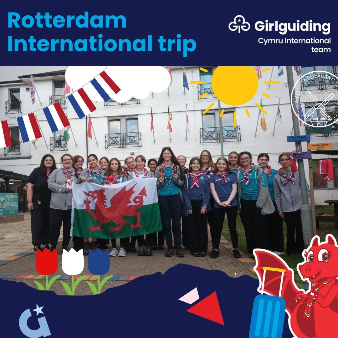 Delyth the Dragon, our Girlguiding Cymru mascot, has safely returned from her latest adventure — an incredible international trip to Rotterdam, The Netherlands! She travelled with four fantastic leaders (Caroline, Vic, Nush and Elin) and 14 brilliant Rangers and Young Leaders, all of whom were selected through last year’s international selection process.