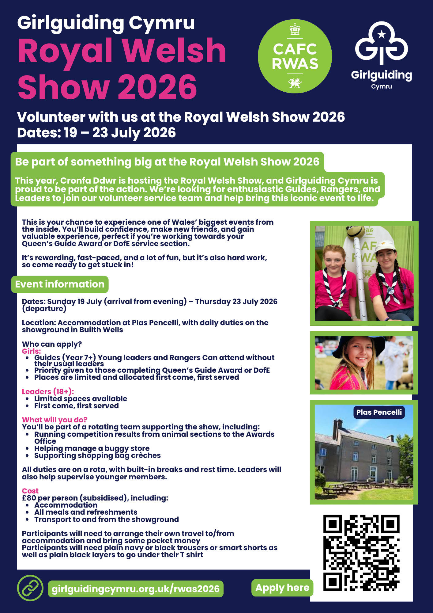 Come along, represent Girlguiding Cymru, support Cronfa Ddwr, and be part of an unforgettable week at the Royal Welsh Show!